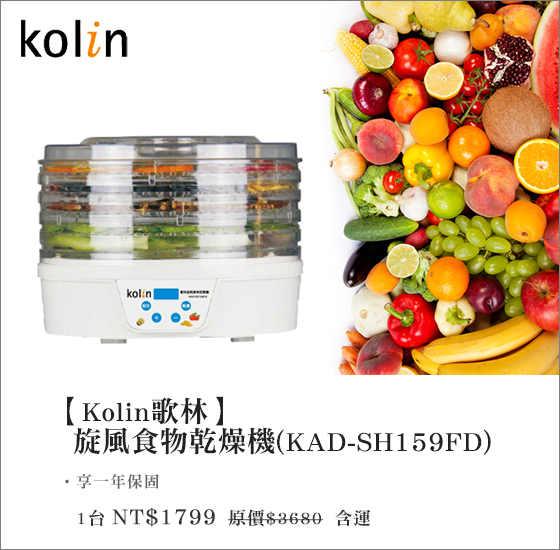 | Kolin歌林-旋風食物乾燥機(KAD-SH159FD)-美味果乾自己就能搞定!自製果乾不添加防腐劑,保留營養、鎖住健康,最天然的果物享受,隨時陪伴你!只要1,799元(含運)即可享有【Kolin歌林 售價:1799 我要購買 |
