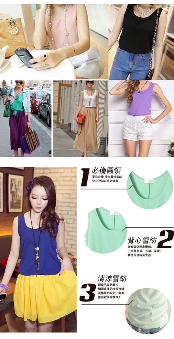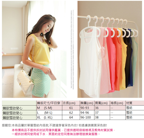夏季百搭款式 ![]() ![]() ![]() ![]() ![]() ![]() ![]() ![]() ![]() ![]() ![]() ![]() ![]() ![]() ![]() ![]() ![]() ![]() ![]() ![]() ![]() ![]() ![]() ![]() 商品說明 品名:韓版中大尺碼繽紛多色雪紡背心 顏色:黑色/黃色/寶藍/西瓜紅/橘色/桃紅/紫色/白色/豆綠 材質:雪紡 產地:中國 尺寸:M/L/XL 試穿報告: M號-C 身高/體重:170cm /60kg: 三圍:36C/28/38 穿著太小 L號-C 身高/體重:170cm /60kg: 三圍:36C/28/38 穿著合身 XL號-C 身高/體重:170cm /60kg: 三圍:36C/28/38 穿著適中 洗滌方式: 1.可水洗晾乾,避免使用冷水精、柔軟精及漂白水,禁止乾洗及使用烘乾機 2.清洗時多少會有掉色的現象,建議深色與淺色衣物分開洗滌,避免染色 3.建議衣物反面放入洗衣袋中,可保衣物壽命延長 4.含有蕾絲珍珠水鑽亮片等商品,勿丟入洗衣機,以利延長商品壽命 5.因每批花布裁剪位置不同而造成花紋位置有所不同,商品顏色會因個人電腦螢幕不同有顯色上之差異,以實際商品顏色為準,請見諒 ※商品圖檔顏色因電腦螢幕設定差異會略有不同,以實際商品顏色為準 ※商品為平放測量,可能會因某些因素產生些許誤差,誤差值在1~3公分上下為合理範圍 |